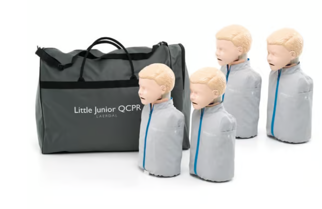 Set of four Little Junior QCPR Light manikins in a convenient soft carry case. Little Junior QCPR is designed to represent a four-year-old child. Manikins are Bluetooth enabled for QCPR app compatibility and include a port to connect a SkillGuide device.