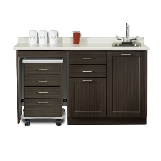 • Choose to locate the sink on the right or on the left side (or center on 72" cabinets only) of the base cabinet. If no location is selected, sink will be placed as shown in the gallery photos. • Stainless steel sink with wing lever, chrome faucet set • Sink dimensions: Outside: 15" x 15" / Basin: 10" x 12" x 6" • Faucet height: 14.5" • Faucet radius: 3" • All sink openings are pre-cut into the top for easy installation