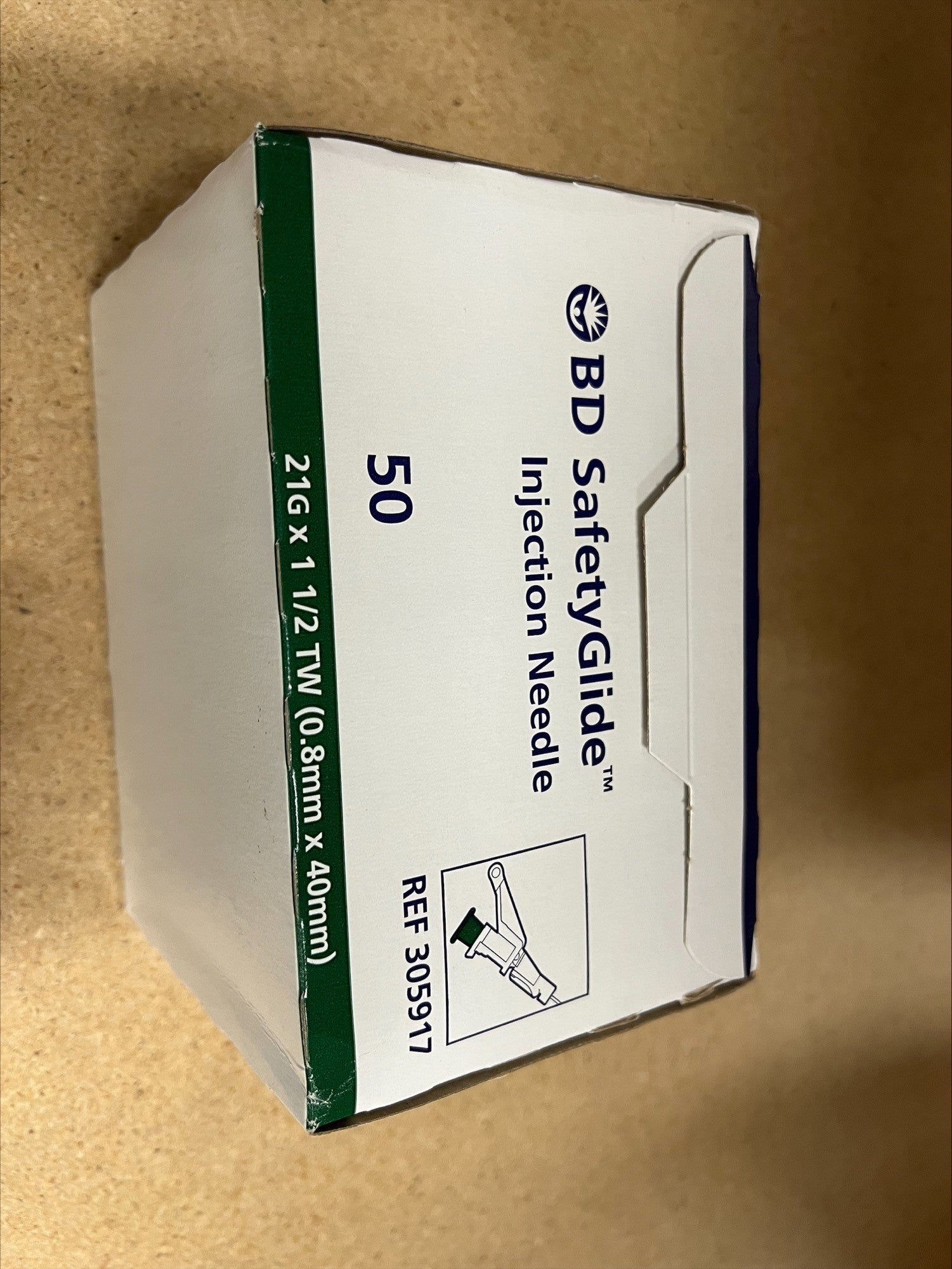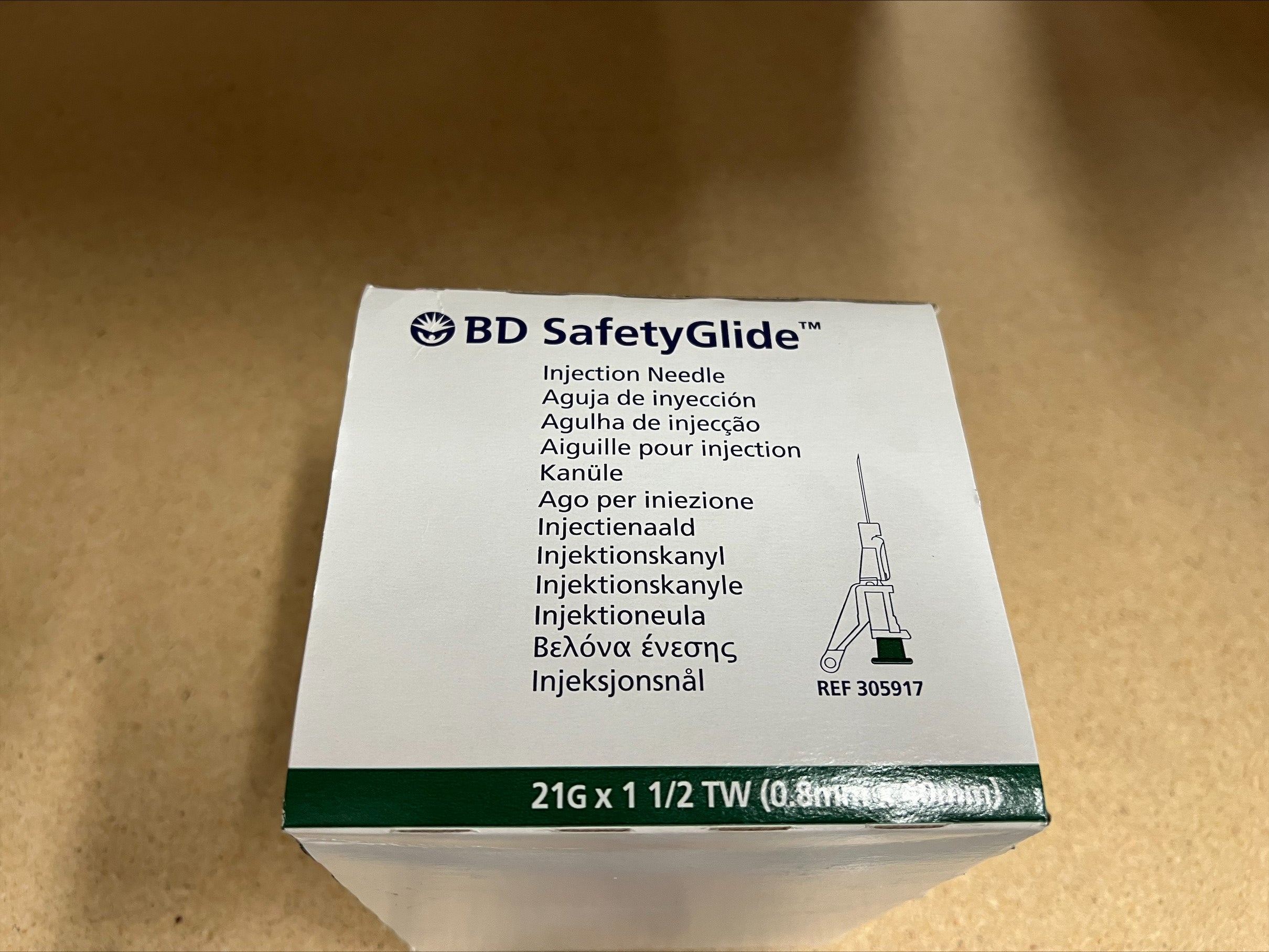21G x 1 1/2" (0.8mm x 40mm): The needle size is ideal for a variety of injection applications.