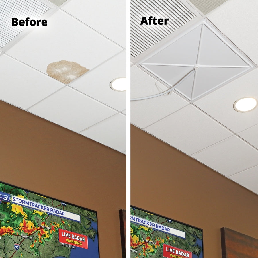 Leak diversion system replaces damaged ceiling tile for discreet channeling of liquids until you find and fix the leak.