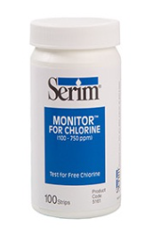 Serim® MONITOR™ for Chlorine 100-750 ppm test strips measure free chlorine. The test gives a semi-quantitative indication that chlorine-based sanitizers have the appropriate concentration of free chlorine required for use in sanitizing hard surface areas and equipment in numerous environments including food processing or preparation facilities, medical/nursing institutions, childcare or adult daycare facilities, schools and agricultural industries.