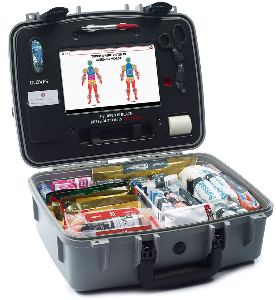 The Mobilize Rescue System comes with the instructions and the supplies needed to respond to a variety of emergencies including severe bleeding, cardiac arrest, seizures, choking, chest trauma, hypothermia, burns, and much more, all while medical assistance is on its way to the user. These supplies are labeled and arranged (color-coded and numbered) to coincide with the instructions on the Mobilize Rescue App.