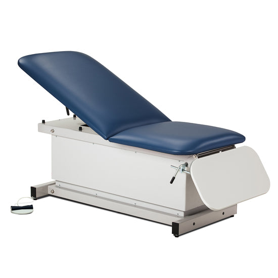 - Clinton Clean™, Solid Plastic Surface, leg rest is adjustable from either side and lowers up to 80 degrees from flat