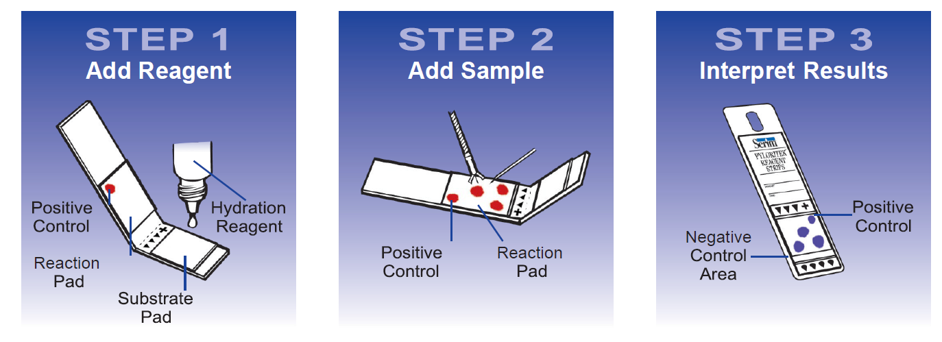 PyloriTek product is widely used in GI centers to assist in the diagnosis of H. pylori infections, the most common cause of gastric ulcers. Each PyloriTek test can test up to 3 biopsies from one patient, includes a built-in positive control, and provides accurate results (96% sensitivity, 97% specificity). Results are available within one hour. Other H. pylori testing options require a separate test for each biopsy plus an additional test for a control. This increases cost of testing and affects reimbursement rates.